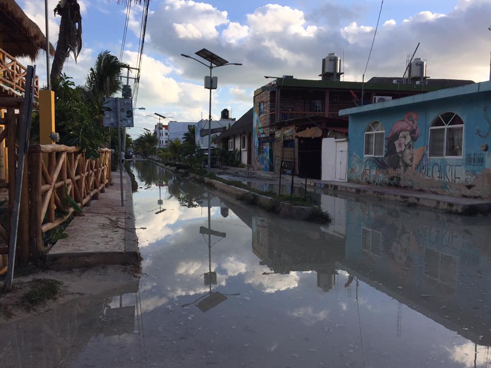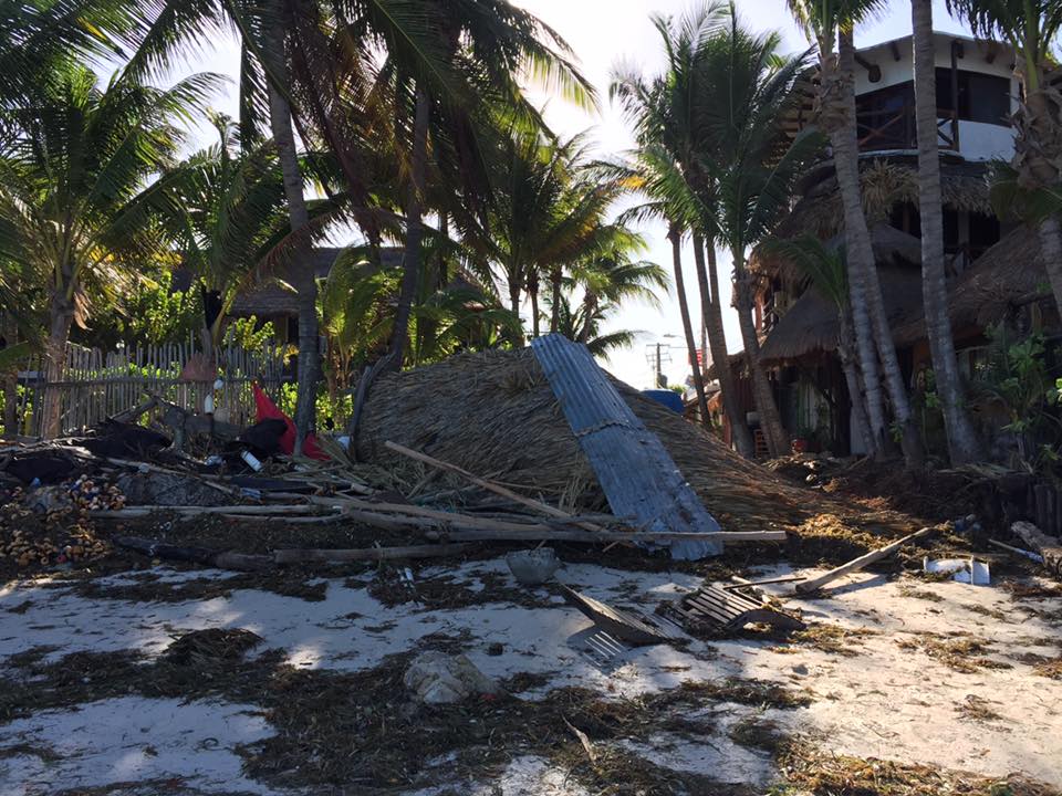 Andra dagen i Holbox överraskades vi av en jättestorm. Och det gick fort. Från sol till storm på ett par minuter. Vi ligger lugnt och solar på stranden och plötsligt ser vi den mörka hotfulla stormen rulla över oss från havet. Vinden tar tag i precis allt. Sanden yr, solsängar, bord och stolar flyger. Det blir total kaos. Regnet piskar ner och vågorna slår hårt mot stranden. Personalen kämpar att få slänga in möbler och madrasser in på hotellets relativt säkra innergård och mycket av grejerna hamnar i poolen.